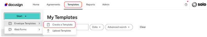 - In DocuSign, navigate to the “Templates” section and click “Start”> “Envelope Templates” > “Create a Template”:
