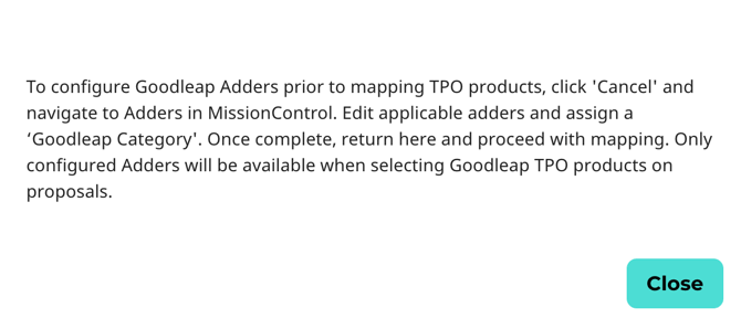 - Turning on the toggle will open up a pop-up with guidance on configuring GoodLeap Adders before mapping TPO products.