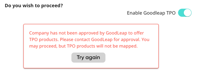 - Once you've been approved on GoodLeap's end, you can manually clear the error sooner by clicking Try Again, which immediately re-runs the sync. This is useful for configuring TPO on the same day GoodLeap updates your credentials.