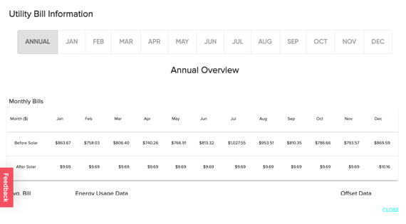 - The Annual Overview will show the estimated bill amounts for one year, both pre- and post-solar. These amounts are all influenced by the utility cost per kWh, escalation rates, energy consumption, and more.