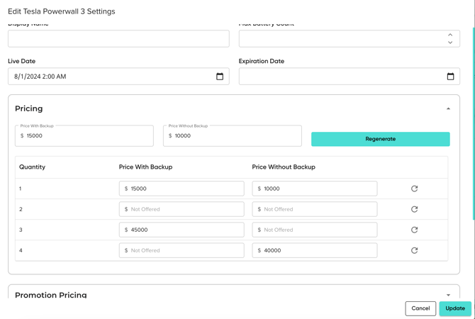 - Each pricing field is editable. You can update the pricing at any point and alternatively, users can remove the pricing if that battery option is not offered.