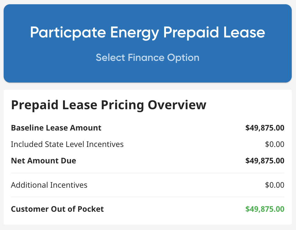 After selecting Participate Energy, review the pricing information shown in the modal beneath the selected finance option.
