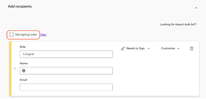 - Do NOT add an email or name to this signing order, as they will be automatically filled when documents are requested.