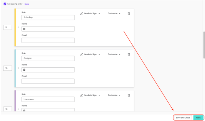 - Once your desired signing order is configured, either click “Save and Close” to complete the template, or “Next” to continue editing the rest of the template.
