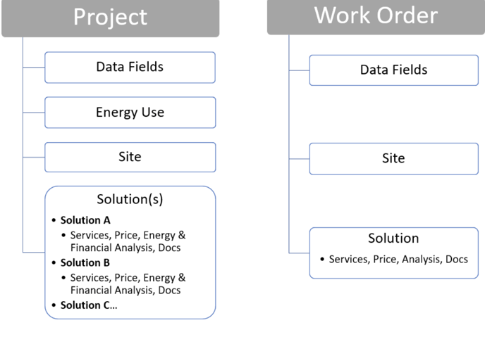 - Energy and Economic Analysis: Projects provide energy and financial analysis of proposed customer solutions by having inputs for customer's current energy use, and doing utility bill projections to assess financial benefits of proposed solutions. Work orders do not provide energy bill analysis.