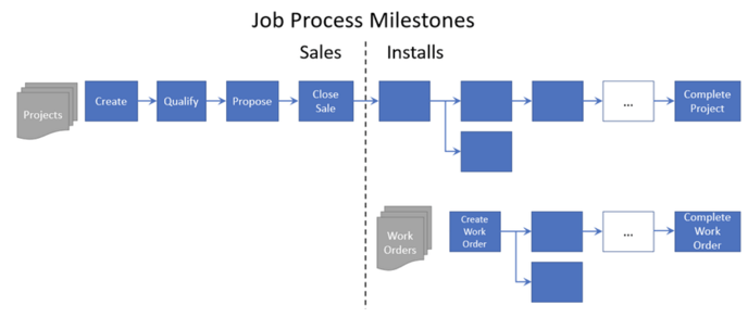 Note: Its possible for some jobs to "blur" the line of what's a project and what's a work order. For example, is adding panels to an existing PV system for an existing customer work order or a project? It depends on how your particular company handles that case. Use the standard project process if it handled by the sales team through the sales process, otherwise use a work order process.