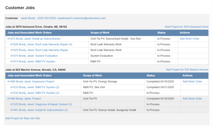 SolarNexus maintains the relationships between all the jobs you may do for a customer. The screenshot below shows an example of a single customer's jobs. All jobs are organized by site address. Work orders are displayed in relation to its originating job.