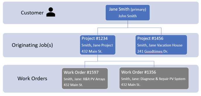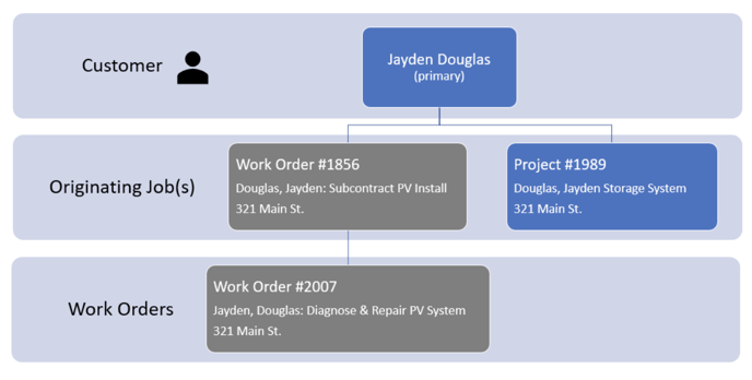 Originating Jobs are typically projects. An originating job may have multiple service work orders that pertain to that job. The example below shows a single customer with two projects. One of which has a couple of service work orders.