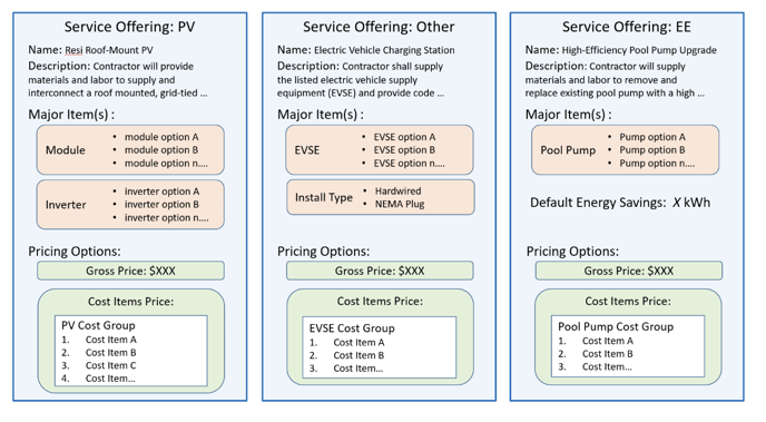 A service offering comprises a definition of a scope of work, including a description and list of major equipment/labor items, estimated energy savings (if an EE measure), and the price for the scope of work.