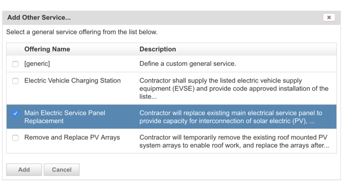 You can define a list of your company's service offerings in SolarNexus to enable your salespeople to easily include those services in customer solutions.