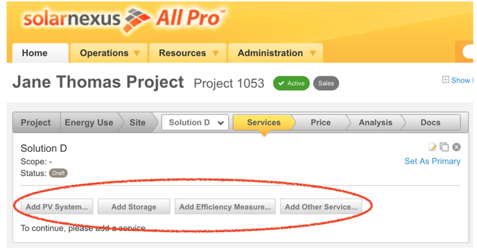 Below is a screenshot showing a new customer solution. Notice the buttons at the top to add services (PV System, Storage, Efficiency Measure, Other) to the solution.