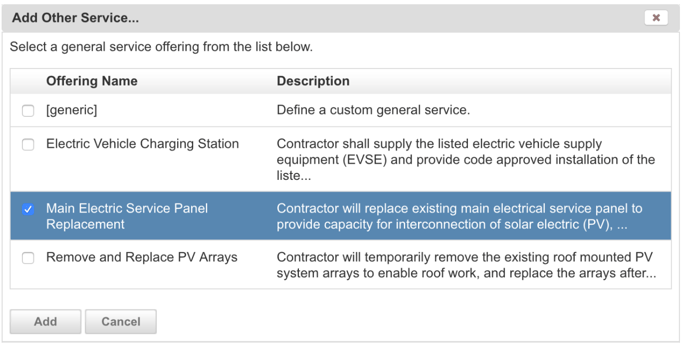 Upon clicking the Add Other Service button, for example, you're given a menu of "general" (non-energy impacting) service offerings to select from: