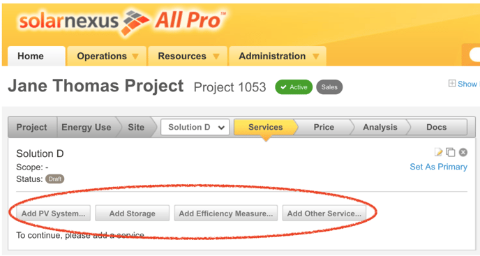 A customer solution consists of one or more services you are proposing to sell to the customer. Services are things like PV system installs, main electric service panel replacements, EV charging stations, energy storage systems, water heater upgrades, etc. Services can generate energy (PV systems), shift energy (storage systems) or save energy (EE measures), or they can represent supporting or standalone work related to energy upgrades (EV chargers, electrical upgrades, roofing work, etc.)