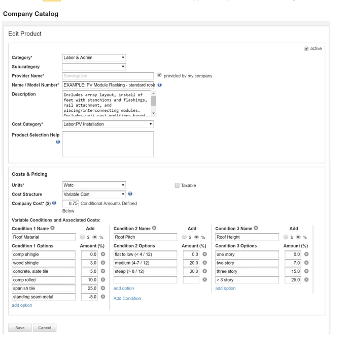 SolarNexus provides the option of defining a product using a variable cost structure to account for cost variabilities within the same product. Below is a screenshot of the editor for a variable cost product. The product example shows costs for module racking installation labor, with added costs based on surface type, roof pitch, and roof height.