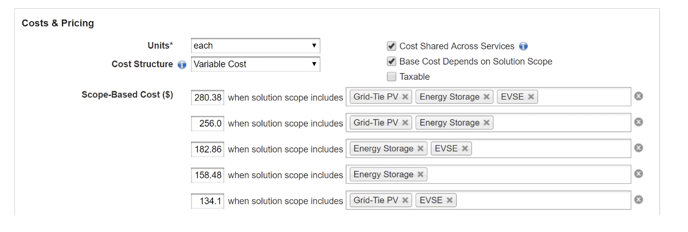 - Base Cost Depends on Solution Scope. When checked SolarNexus will look for a match in the scope of work for the solution to the input scope-based cost instances. If found, SolarNexus will use the input cost amount for the cost item. If not found, it will use the default amount when solution scope does not contain a defined combination of scope values.