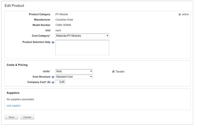 The top section shows the basics about the product. In the screenshot above, the product was added from the Public Catalog. The product provider/manufacturer name and model number was defined by SolarNexus and cannot be edited.