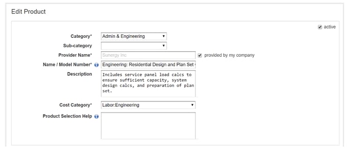 - "Active" checkbox. The "Active" checkbox allows the resource manager to temporarily disable a product so that the sales staff cannot use it in any new projects. This feature is handy when a product is temporarily unavailable.
