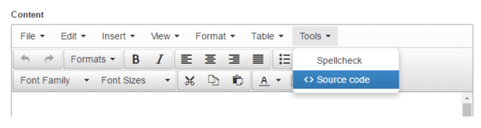 Under the covers, the document is actually created using HTML. Our WYSIWYG editor includes a text editor where the source code can be edited directly. To access the source code editor, select the "Source code" option from the Tools menu: