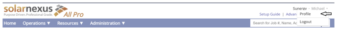 To get your API key, log in as the User you'll be using, per the above description. Rollover the username at top right, and click the "Profile" link in the menu that appears: