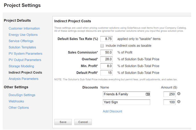 - Default Profit - Defined as a percentage of solution sub-total price. SolarNexus automatically adds this amount of profit to each solution by default when it is created.