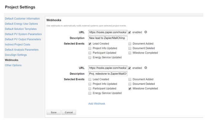 - Setup Webhook in SolarNexus. For each Zap, setup a webhook: