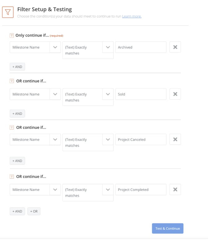 - Specify the four Milestone Names that you want the Zap to proceed with (filtering out the others). Use the "OR" condition and setup as follows, using the EXACT MILESTONE NAMES: