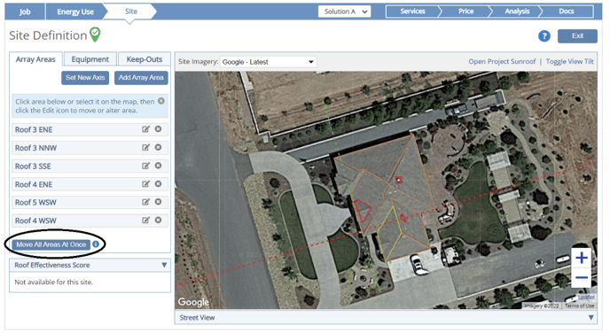 If you find that the image has moved a few feet, you can move all of the areas you previously created (and any arrays defined in the areas) back onto the house in the image. This is done ONLY on the array areas editor (Site > View/Edit Array Areas). Look for the Move All Areas button at the bottom of the areas list.