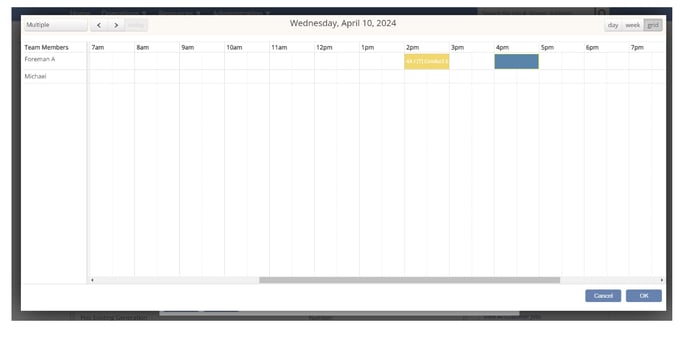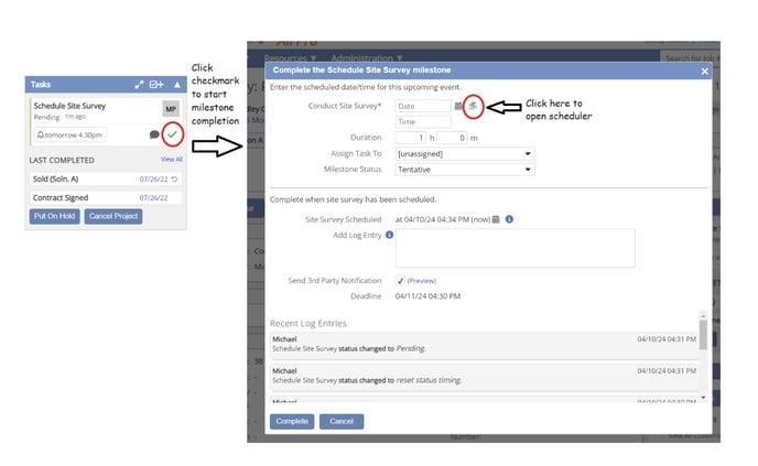 The user is prompted to schedule a time for the future "Conduct Site Survey" milestone. The user can click the Scheduler icon to see side by side availability of multiple people, and allows them to put the event in a desired timeslot: