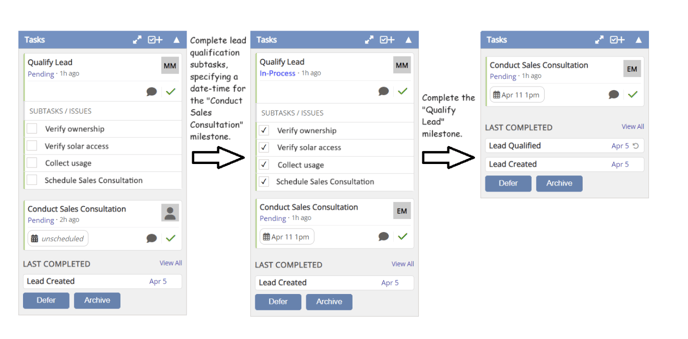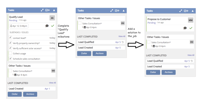 The series of Tasks section screenshots below shows an example where there is an optional subtask on the "Qualify Lead" milestone telling the user to 'Schedule Sales Consultation' (required subtasks have an asterisk).