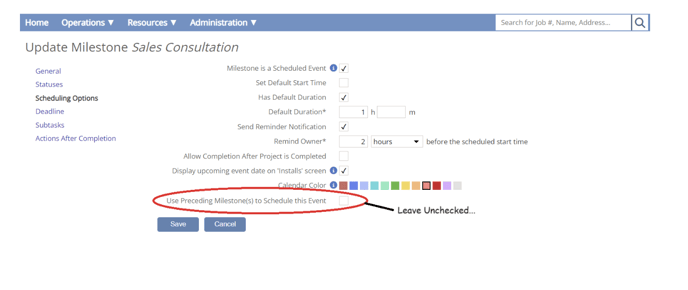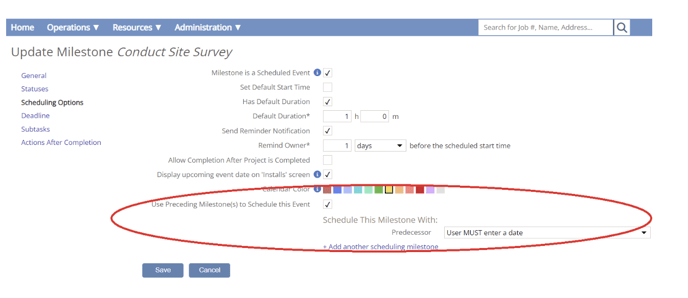 Also note that when using a preceding milestone to schedule this event, the admin can define whether the user MUST enter a scheduled time when completing the predecessor, or will be allowed to complete the predecessor without actually inputting a date-time on the calendar.