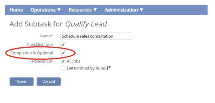 By default, Subtasks are required by default. The administrator can make the subtask optional for the "Qualify Lead" milestone by checking the "Completion is Optional" checkbox, as shown below in the admin screenshot for the 'Schedule sales consultation' subtask: