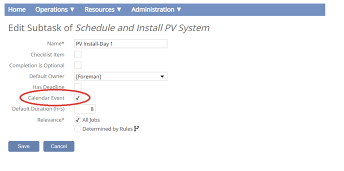When an administrator defines subtasks on a milestone, the subtask may be defined as a calendar event, see below.