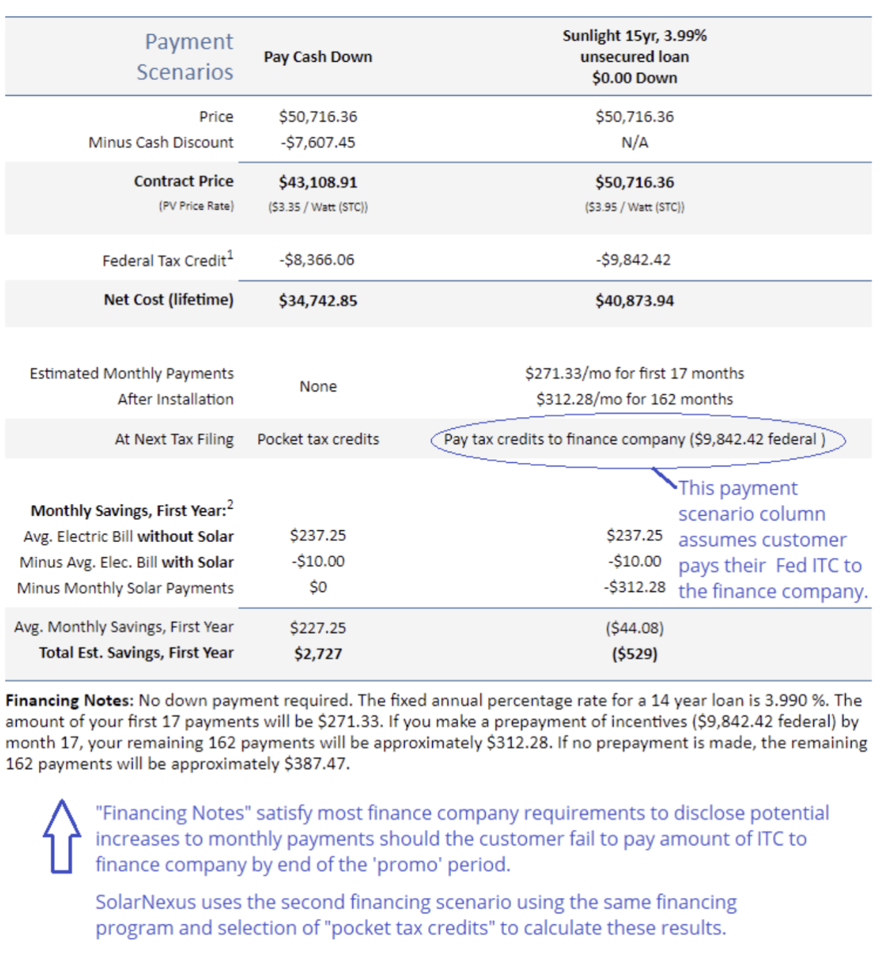The SolarNexus provided document template recognizes this special condition and outputs its price and payments page to summarize both scenarios - with the assumption being that paying the ITC to the finance company will be the best case. Rather than show two separate columns for the same finance program, the SolarNexus proposal only shows that option one time, and provides the "Financing Notes" disclosure as the representation of the case where the customer pockets their ITC (or doesn't qualify for them).