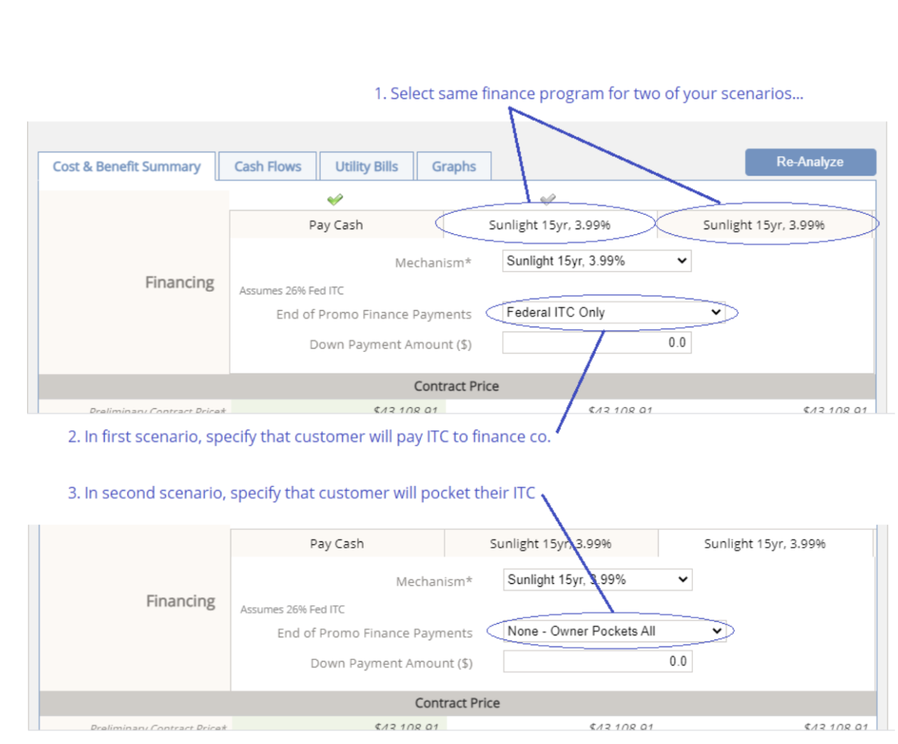 - Setup a second scenario by selecting THE SAME FINANCE PROGRAM, but in the second case, specify that the customer will pocket their ITC. (See the screenshot below)