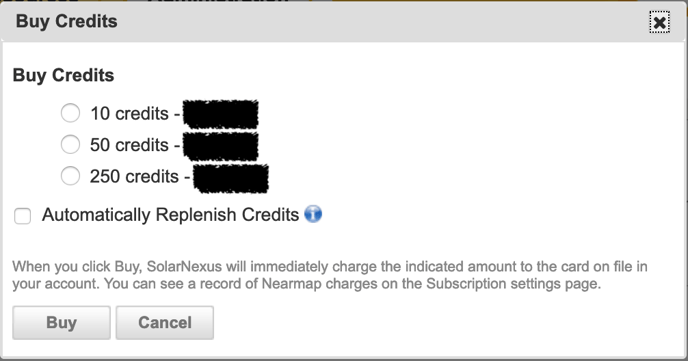 If you want SolarNexus to automatically replenish your Nearmap credits when they run low, check the "Automatically Replenish Credits" box. You can change your auto-replenish settings at any time from the main Nearmap settings screen.
