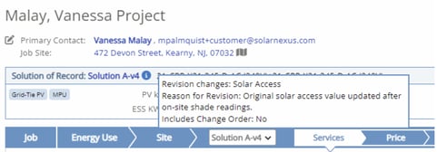Solutions may also be revised if more accurate data becomes available. At many companies, solutions may be proposed and sold using remote data. After the job if sold, the technical site visit may obtain more accurate solar access percentages, array orientation, or array azimuth data, all of which effect the estimated PV production. Furthermore, the proposal may have been created using preliminary usage data, so you may wish to revise the sold solution once more complete usage data is obtained. This guarantees that the solution of record contains the most accurate production estimate and economic analysis. These types of revisions usually don't require a Change Order.