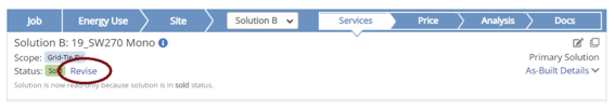 After completion of the Sold milestones for a given solution, SolarNexus adds a "Revise" link to the Solution header, next to the Status indicator.