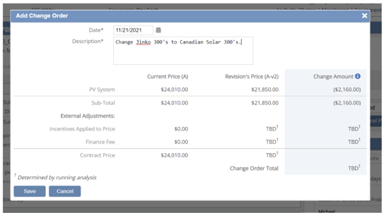 Note that until UNTIL the analysis is run, SolarNexus will show "TBD" for revision price and Change Order amount because of the potential for incentives or finance fees to be factored in. Then it will be automatically updated.