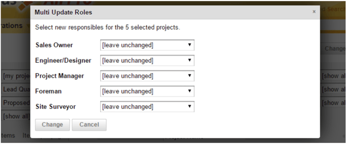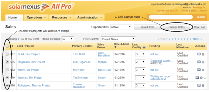 You can batch assign, or re-assign users to project roles from the Sales or Installs screen. For example, maybe a sales person has left the company and you want to re-assign the Sales Ownership of that person's projects prior to deactivating that user. Simply go to the Sales screen and use the filters to show the projects currently owned by the exiting sales person. Check the boxes of the projects that you want to re-assign to a specific user. Then click the Change Roles button (see below).