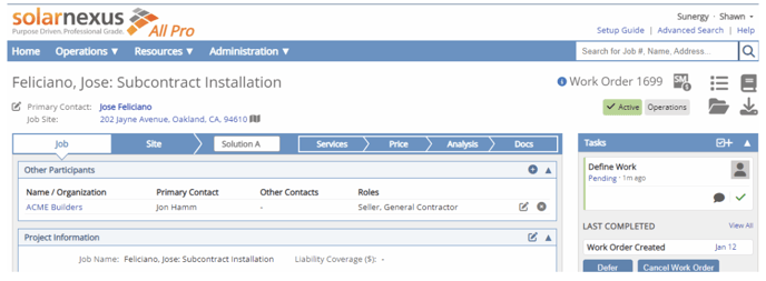 - Add job with homeowner/end-customer as the "Customer." Every time you add a new subcontract install, you use the "Add New..." button and select "Work Order: Subcontract PV Install." You input the homeowner/end customer information as the customer. Then you followup by adding the originating contractor as the "Seller" role (maybe even the "General Contractor" role as well).