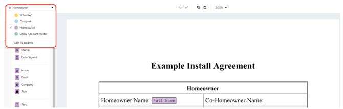 Data labels will be assigned to different signers to review or interact with. They’ll be color-coded according to the signer responsible for filling in, viewing, or signing. You can adjust the signer for new data labels in the top left corner: