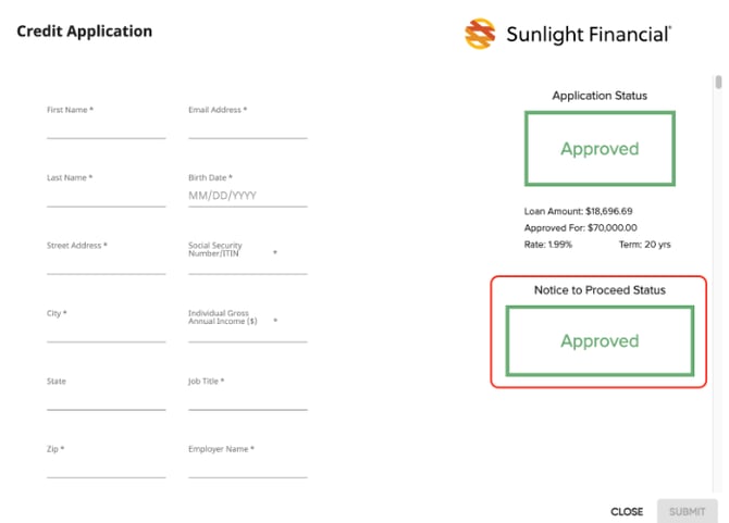 For the Instant NTP to appear on the proposal, Solo must first receive signed install documents. Once those are received, we will send that information to Sunlight to trigger instant NTP. Once Sunlight has a NTP status in the record, Solo will update the UI in the credit application modal of the proposal. This should take a matter of minutes.